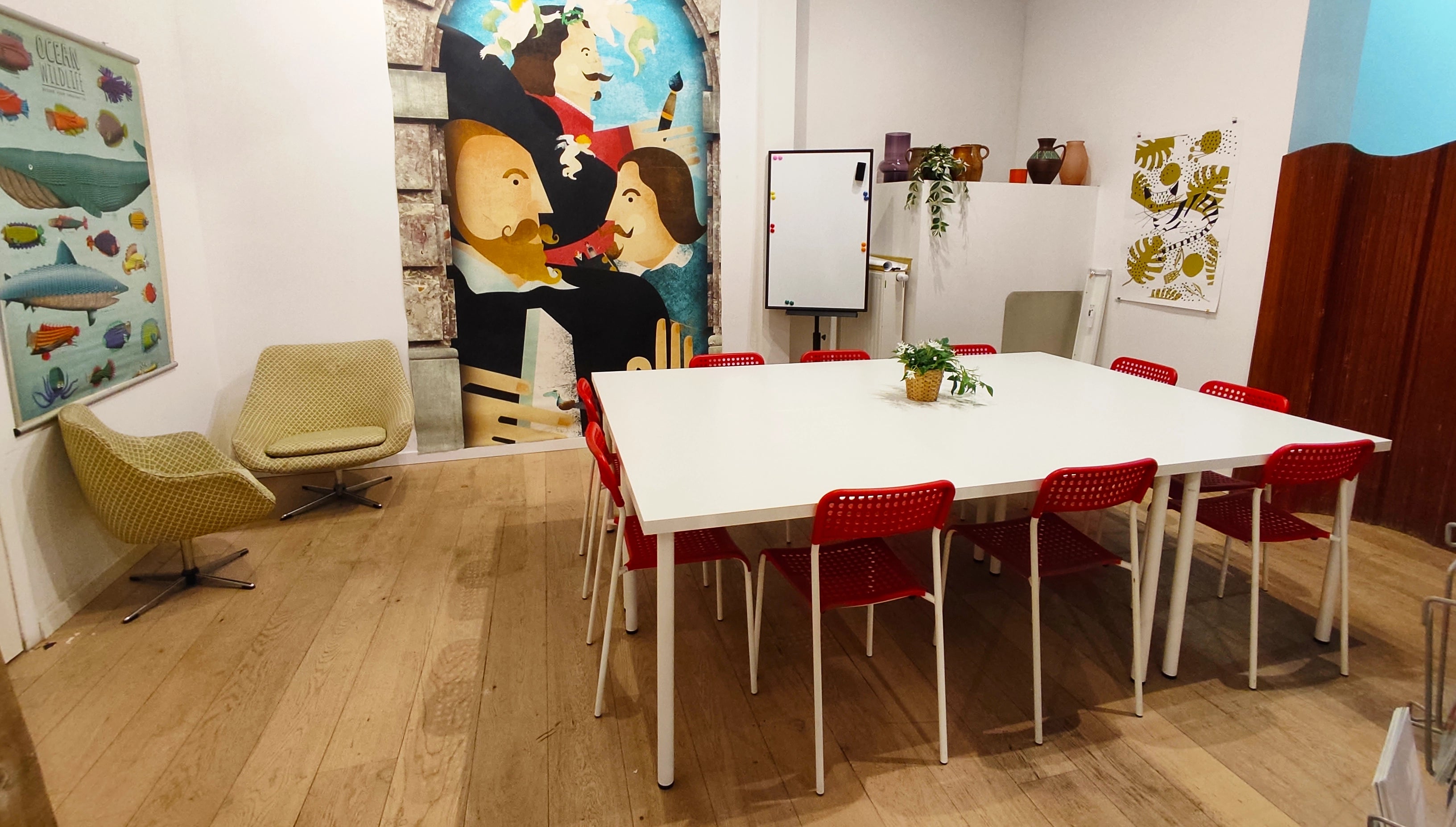 In the heart of Antwerp, a few steps from the Grote Markt and the Groenplaats, we offer a small creative space for groups up to 10 people. Wether it's for a workshop, a book presentation, a meeting or a team building, this space is ideal. Because it's at the back of the illustration gallery, you will be inspired just by walking around.