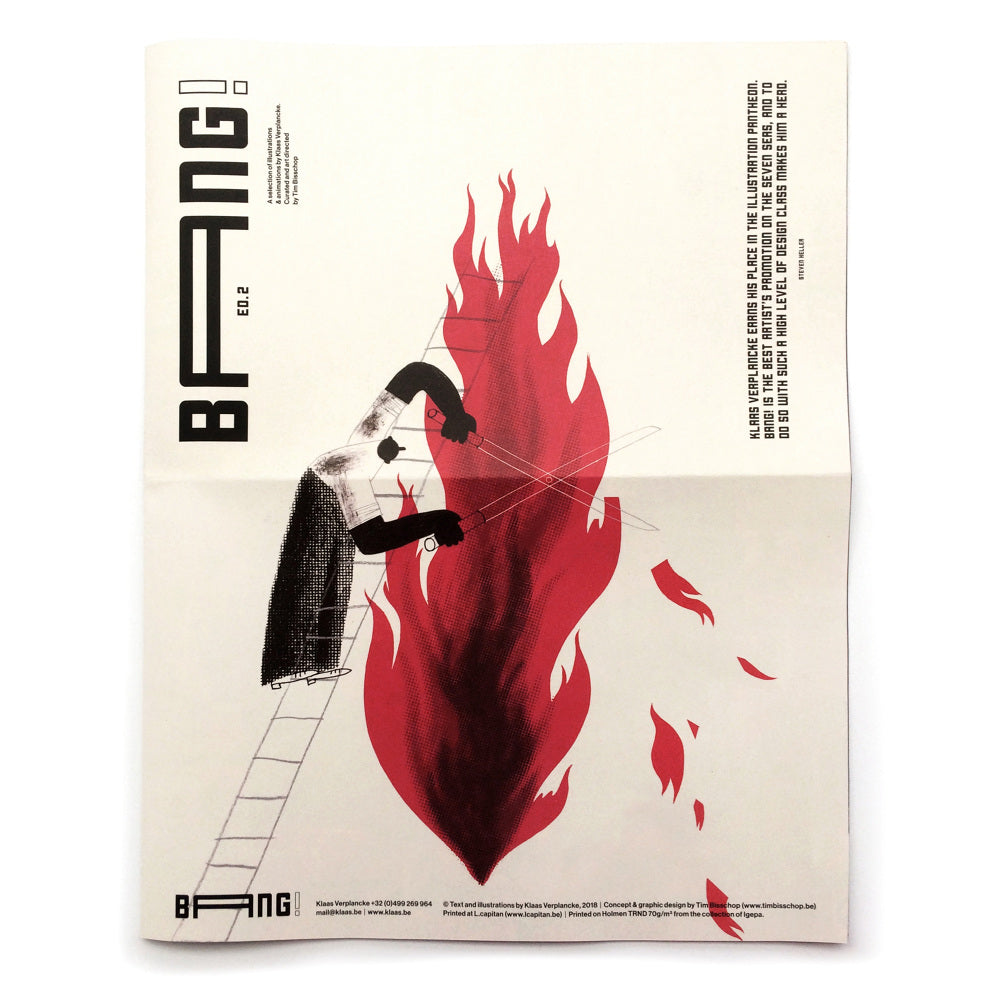 BANG! is a 16-pages printed tabloid paper. Every issue invites a cutting edge guest designer to work with the illustrations of Klaas Verplancke. This creates an innovative and unique fusion between graphic design and illustration that blows your eyes and mind. This second edition of BANG! was art-directed by Tim Bisschop. BANG! was printed in very limited quantities, and we have some in stock, so get your copy now!