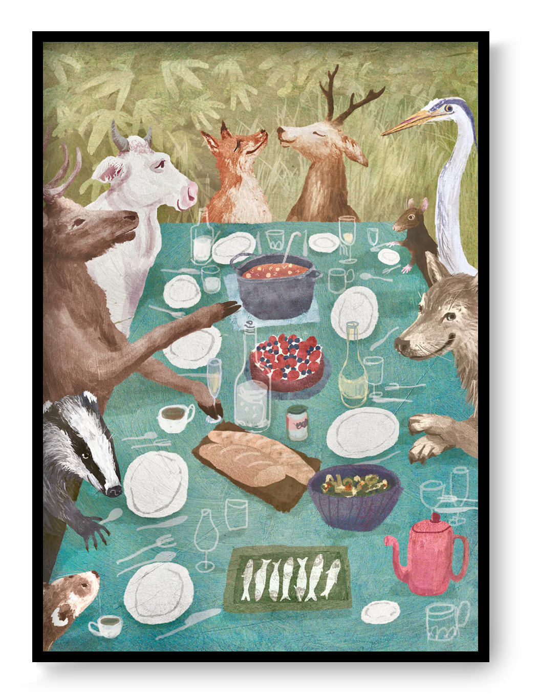 Everyone’s invited to the forest table! In Bosfeest, Stien van Kerckhoven paints a playful dinner where animals gather to celebrate togetherness. A cozy, heartwarming piece that adds joy and magic to your walls.