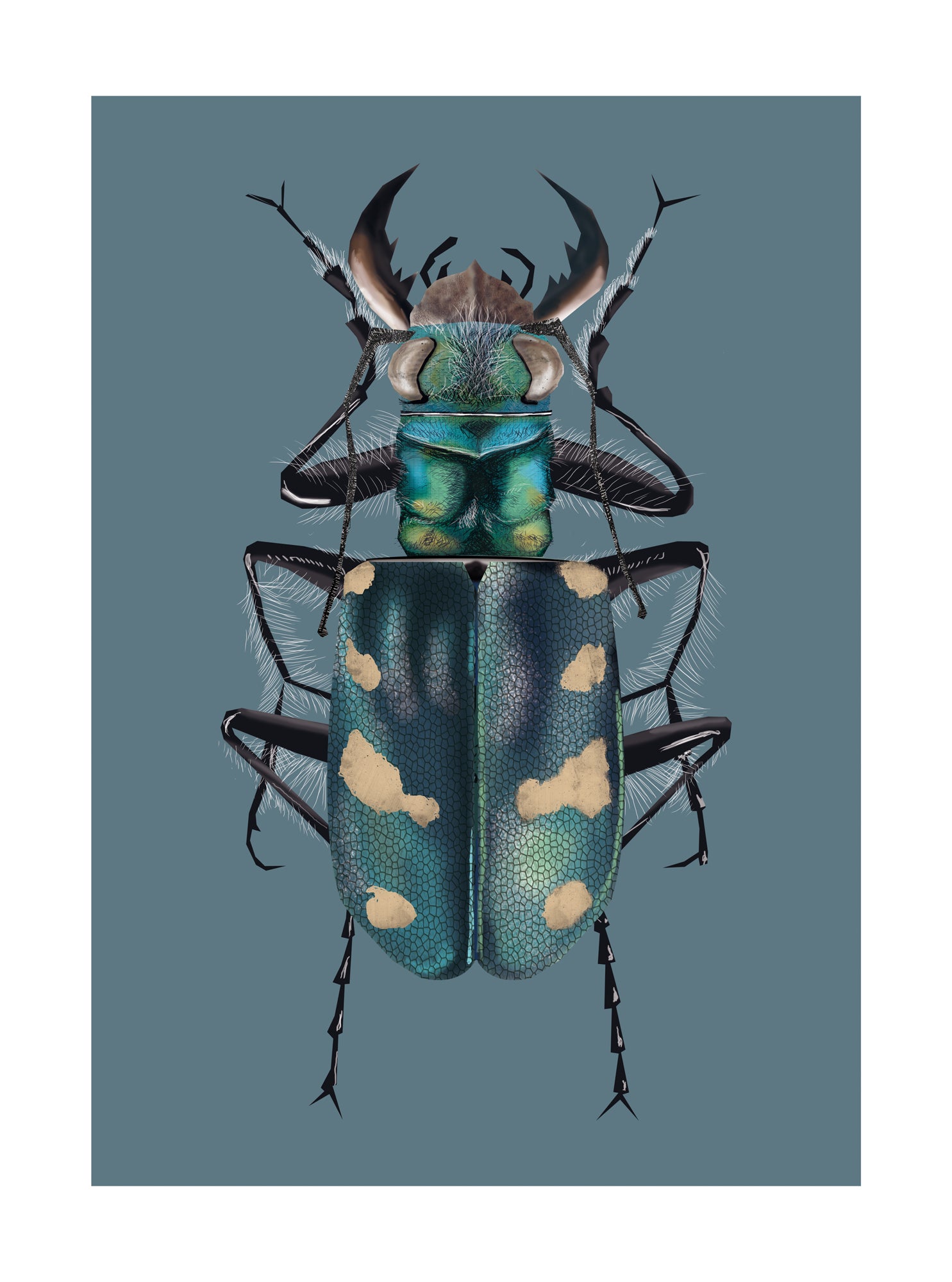 Dune Tiger Beetle turns a small creature into a strong visual symbol through color, symmetry, and graphic clarity. The bold composition gives the print a confident presence that feels modern rather than illustrative. A striking wall art print for interiors that enjoy nature interpreted through design, not decoration.