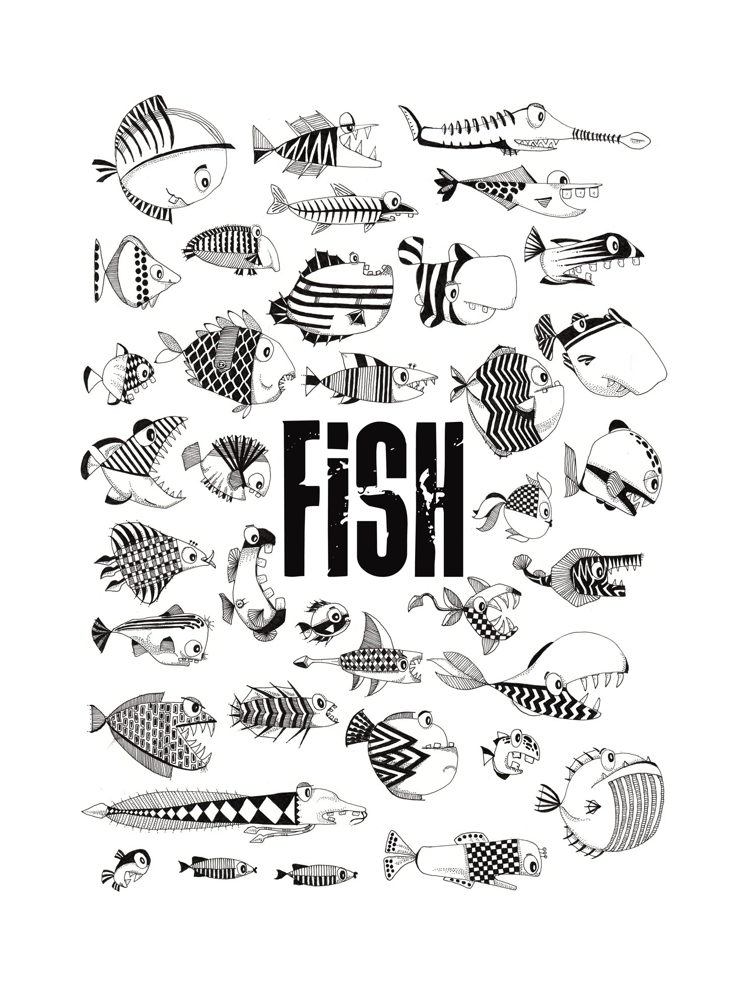 Fish is a black-and-white illustration built like a visual inventory. Dozens of hand-drawn fish, each with its own pattern, expression, and personality, surround a bold central title—creating a playful tension between order and absurdity. Graphic, humorous, and highly readable from a distance, this print works as a strong statement piece for modern interiors that don’t take themselves too seriously.